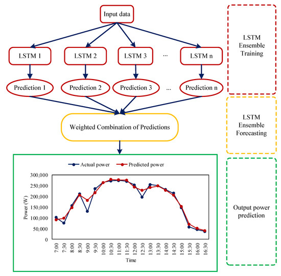 The ensemble methods have been introduced for improving the performance and learning accuracy of the machine learning models. This paper uses an enhanced model of the ensemble LSTM for the output power prediction of PV plants [37]. The architecture of the ensemble LSTM is developed based on some single NNs used as predictor models. Figure 9 shows the three layers of the ensemble model including input layer, training layer, and forecasting layer (output layer). In the input layer, the electrical and environmental data are given to the LSTM network. Next, inside the training layer, each LSTM model is trained separately. Finally, for final output prediction, a particular weight coefficient is assigned to each model’s output for output forecasting of the ensemble LSTM calculation. In this model, the weight of the prediction and output forecasting are according to Equation (8), which considers the entire M LSTM models that are presented in a set of models. The ensemble prediction results for the time series are represented as with observations. Parameter signifies the prediction output obtained using of th LSTM model (at the th time interval) and is subject to weights composition. In Equation (8), each weight is related to a prediction output of the LSTM model, where, and .