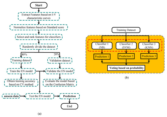 In this paper, an ensemble learning (EN) model for fault diagnosis of PV arrays is investigated in order to achieve superiority in classification accuracy. Figure 10a shows an overview of the required steps to build an EN-based fault classification model. As a supervised machine learning technique, the EN-based model relies on a certain number of fault features extracted from the raw data obtained. To achieve a high diagnostic performance with a low computational burden, a feature selection algorithm is utilized. To evaluate the performance of the model, the labeled samples are divided into training and validation sub-sets. The training set is used to train the model, while the validation set is used to measure the performance of the model. Then, we have tested the learning algorithm by an unseen dataset with dissimilar input parameters to the original dataset.