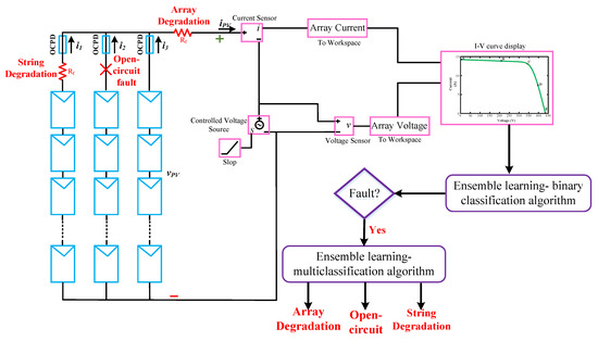 As shown in Figure 11, two layers of the EN model are designed to detect any fault and classify its type. The first layer aims to detect the fault condition through a binary classification. The second layer includes the multiple classes, which classify the type of defects by a multi-label classification algorithm. There are three kinds of outputs, namely open-circuit, string, and array degradation faults.