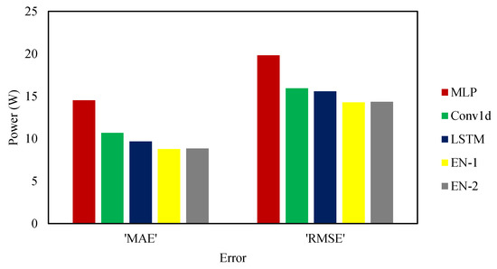 Figure 12 shows the performance of the trained models. According to Figure 12, by comparing the errors of the models in two metrics (RMSE and MAE), the ensemble model has a better performance than other models in both indices. For further analysis, we also list the forecasting errors evaluation considering multiple models as numerical results, see Table 5.