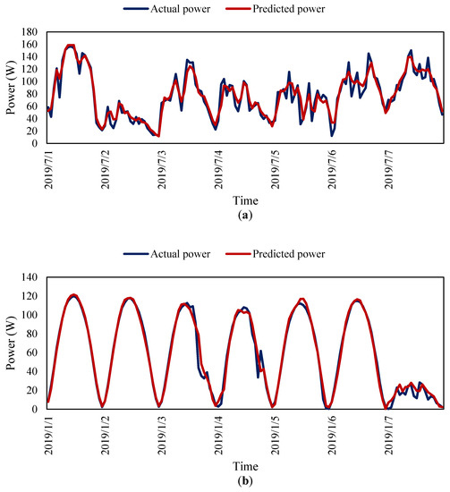 According to the results of the output power prediction, the EN-1 model has shown better performance. Figure 14 represents the output power forecasting of the LSTM ensemble model. As shown in Figure 14a, the graphs of actual and predicted output power during one week in summer are depicted. Figure 14b illustrates the actual and predicted output power during one week in winter. As we can see, there exists a good convergence of the predicted output power to the actual output power in different seasons. Therefore, this model is able to accurately predict the output power of the PV system.