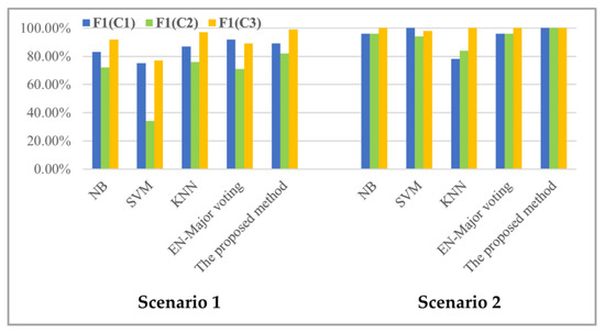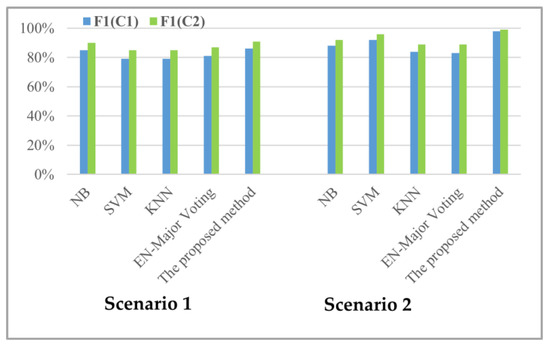 Furthermore, based on the confusion matrix, we have defined the accuracy and F1-score measures (Equations (13) and (14), respectively) to assess the performance of the learning algorithms.