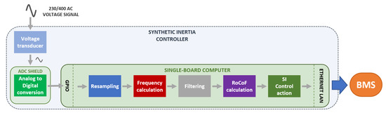 In this paper, the capability of a low-cost controller aimed to provide real-time synthetic inertia control of a BESS is assessed. The main characteristics of the proposed controller are that it must be autonomous (no external frequency/RoCoF signal should be needed) and based on the use of low-cost technology. More advanced frequency measurement can be provided using intelligent electronic device (IED) or phasor measurement unit (PMU) technologies, which are clearly not suitable for end-user applications due to their high costs [22,23]. The controller studied in this paper is instead based on a very low-cost architecture (below USD 100), being based on the use of an off-the-shelf single-board computer. In our implementation, a Raspberry Pi 4 Model B was used, but clearly any other similar processing unit could be adopted. This device has the following technical characteristics: 64-bit quad-core processor, 4 GB of RAM, dual-band 2.4/5.0 GHz wireless LAN, Bluetooth 5.0, Gigabit Ethernet, USB 3.0, power over Ethernet capability, and a standard 40-pin general-purpose input/output (GPIO) header.