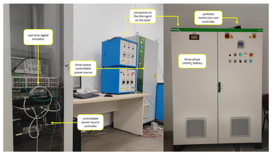 The power hardware-in-the-loop test bench is shown in Figure 2. The real-time simulator OPAL RT5600 (OPAL-RT Technologies, Montreal, QC, Canada) is used to simulate the electromechanical response of a generic power system, whereas the programmable power source Triphase PM15A30F60 (Triphase, Holsbeek, Belgium) is programmed to control the entire microgrid in grid-forming mode. Through synchronous communication, based on a fiber optics channel, the real-time frequency of the simulated system is sent by the real-time simulator (RTS) to the programmable source. This frequency value is imposed in real time on the actual microgrid and, therefore, on all its components. The frequency excursions following load/generation imbalances, which are controlled through the primary frequency regulation of the simulated system, are applied to the microgrid and to the BESS under study.