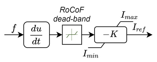With the aim to avoid an excessive control activity of BESS around the frequency equilibrium point and endanger the lifespan of the battery, a 10 mHz/s RoCoF dead-band was assumed. Moreover, the saturation block limited the direct current reference to [−5,+5] A, thus about kW in charge/discharge mode.