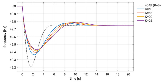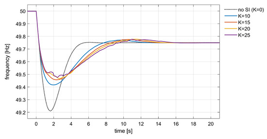 In tests, increasing values of gain K in the interval 10–25 A/(Hz/s) were used in order to study the dependence of the system frequency response with respect to the amount of active power provided by the inertial control. Figure 6 shows the frequency response of the simulated system after the introduction of the SI support with various values of gain K. The black dashed line represents the system frequency response without any SI support, which was previously calculated and assumed as base case. Differently, all other curves are the frequency trajectories obtained in the presence of BESS synthetic inertia control. The observed response is coherent with the typical effects of fast SI control actions [13]. In comparison with the base case (no SI control action), higher frequency nadir points were reached, even though the settling time was increased.