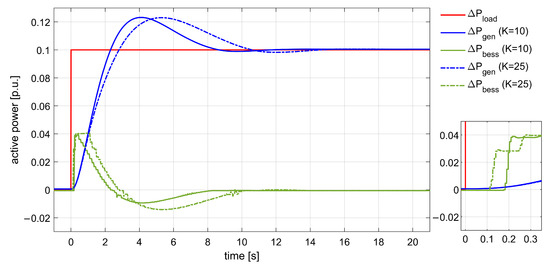 Ideal controller: BESS active power response with different gain K.