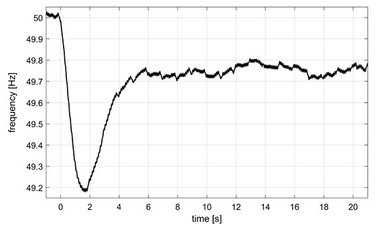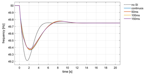As shown in Figure 4, the load step variation gave rise to the frequency transient represented by a dotted black curve. After s, the frequency trajectory reached its minimum, or nadir, at Hz. Then, thanks to primary regulation, system frequency is brought back close to its nominal value, settling to about Hz. Without synthetic inertia support, frequency control was only provided by the synchronous generators that, by means of the primary frequency regulation, adjusted active power generation according to the simulated response of the turbines’ governor. After about 6 seconds from the contingency, the power response , depicted in Figure 4 with a continuous blue curve, reached the same value of the applied load variation . A power overshoot of about p.u. was reached during regulation.