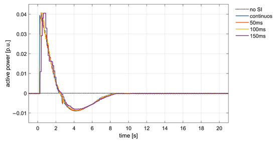 As previously mentioned, in these tests, an ideal SI controller is just emulated in the RTS. The SI control law is obtained according to the scheme Figure 5. The RoCoF signal is calculated during the simulation by deriving the continuous frequency signal. RoCoF is therefore a continuous quantity, known instantaneously at each simulation time step (i.e., 0.125 ms). Due to the absence of delays and measurement errors in the RoCoF signal, as shown in Figure 5, no filters were adopted in the control chain.