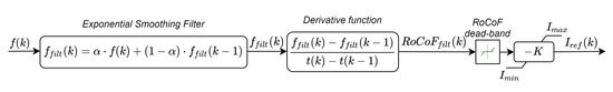Since low-cost applications, such as the one proposed with this single-board controller, cannot make use of high-accuracy transducers and signal processing instrumentation, measurement errors must be filtered. In the following tests, a low-pass filter based on exponential smoothing was applied to frequency measurements. The SI control scheme programmed on the single-board SI controller is shown in Figure 11. The filtering action can be modulated by varying the smoothing factor in the range . The maximum filtering action is obtained with , whereas the filter is completely deactivated with . Samples and are, respectively, the samples of the filtered and not filtered frequency at the time instant t. The RoCoF signal is calculated from the filtered frequency measurements using a discrete derivative function. Smoothing is needed not only to filter measurements but also to reduce the stress on the controlled component and avoid too many sudden power variations that can impact the cells’ lifetime.