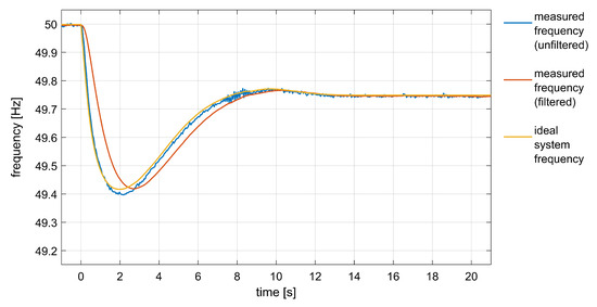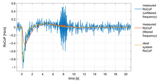 In Figure 12, the frequency response of the simulated power system during a generic frequency event is compared with the filtered and unfiltered frequency values measured by the controller at the microgrid switchboard where the BESS is installed. Figure 13 shows the corresponding values of RoCoF. The filtered signals were obtained with a smoothing factor equal to 0.1. It can be observed that the filtered signals were slightly delayed, but the beneficial effects of the filter during a frequency measurement disturbance, arising around s, are clearly visible. The RoCoF error is drastically reduced, also allowing to keep a small dead-band on RoCoF (i.e., Hz/s in all simulations with the real controller).