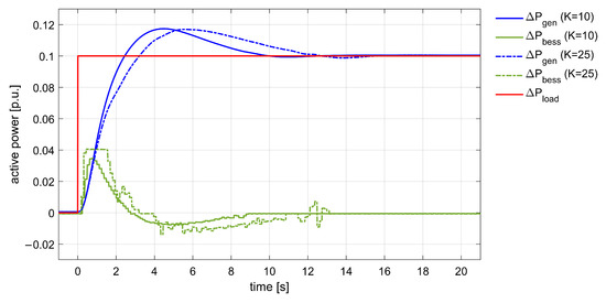 In general, it can be observed that an increase of gain K allowed to reduce the frequency derivative in the very first instant and reach a higher nadir. However, higher magnitude of inertial control corresponds also to larger second overshoot and longer settling time. From Figure 7, it is possible to observe how control gain affects system response. A lower gain reduces the BESS participation in frequency control, letting the synchronous machine more rapidly take care of the power imbalance. The synchronous generator overshoot decreases with SI contribution. In the PHIL tests, this overshoot was reduced from p.u. of the base case to and p.u. for the case with and , respectively. Having reached the nadir, the SI control action changes its sign: for this reason, higher gains cause an increase of the second frequency overshoot and an increase of the time necessary to reach steady state.