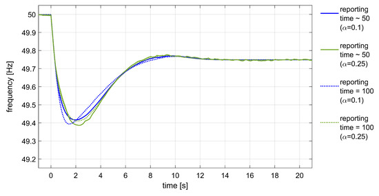 Further tests were carried out to investigate the influence of the measurement reporting time with the smoothing factor . As shown in Figure 16 and Table 4, a higher smoothing factor () allowed reduction of the initial RoCoF, but the frequency response was still characterized by a lower nadir and permanent fluctuations due to the effects of RoCoF error. However, since RoCoF estimation is derived from two subsequent frequency measurements, the RoCoF error can be reduced with a slower frequency reporting rate. As observed in [24], since frequency measurement is based on the evaluation of power system voltage, frequency computation can typically be updated every few cycles, 90–120 ms. Since a trade-off between fast enough and accurate frequency measurements is needed, according to ENTSO-E, accurate RoCoF calculations should be based on sliding windows which average results over few consecutive measurements. Robust results can be obtained, for example, in about s if a 100 ms time resolution is used. For this reason, some further tests were carried out introducing a small delay in the frequency reporting of the controller, so that more accurate RoCoF estimations can be used by the controller. The effect of increasing the reporting time up to 100 ms is shown in both Figure 16 and Table 4.