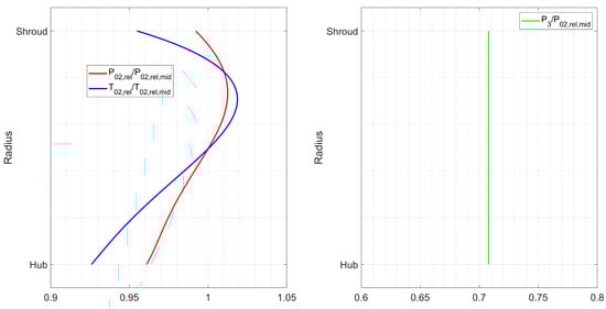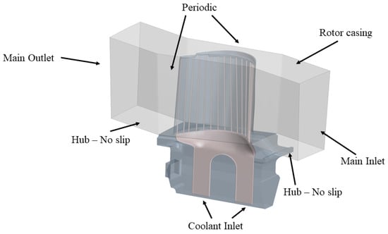 The numerical domain of the present investigation is reported in Figure 1. In order to impose a representative flow profile at the main inlet of the rotor blade, streamlines analysis have been performed in AxStream® by Softinway Incorporated on the full gas turbine. Relative pressure, relative temperature, and yaw angle radial distributions were then fitted using a polynomial law and imposed as boundary conditions for the rotor blade. Concerning the rotor outlet, an average static pressure has been applied. More details about the main-flow boundary conditions can be found in Figure 3. The inlet relative total pressure and temperature are normalized to the corresponding mid-span values. The outlet static pressure is normalized with respect to the inlet relative total pressure at the mid-span. As far as the coolant is concerned, uniform relative total pressure and temperature have been imposed at its inlet sections. These were obtained with the internal simulations of the secondary air systems of the turbine, as reported in Baratta et al. []. For the present investigation, the relative total pressure at the coolant inlet section is set to , while the relative total temperature is set to . Regarding the solid, the thermal conductivity and the specific heat have been set equal to W/(m·K) and J/(kg·K), which are characteristic of the IN-738 at 500 ∘C. No thermal barrier coating or surface treatment is present in the investigated configuration.