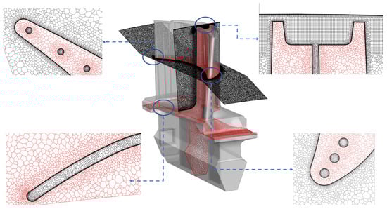 CHT is solved all over the blade profile and the internal walls of the root. The other solid walls, namely the casing and the external root surface, are treated as adiabatic. For the numerical simulations, the fluid and solid meshes are generated directly by Simcenter STAR-CCM+. Polyhedral and prismatic elements are used to generated a hybrid mesh where 15 prismatic layers are enforced to solve the main-flow boundary layer, whereas 10 prismatic layers are enforced to solve the coolant boundary layer. The average over the blade profile is ≈1, with a maximum value close to 1.2 close to the tip region, due to the presence of the tip leakage vortex (TLV). As far as the internal channels are concerned, the average is equal to 5, mainly because of the high turbulent region close to the inlet sections of the channels. The target mesh size is around 1.5% of the blade axial chord, while the surface mesh dimension over the blade profile is equal to 0.5% of the axial chord. A mesh refinement procedure is enforced to solve the interaction between coolant and main-flow over the tip gap. In this region, the average mesh size is equal to 1/3 of the global size. The final mesh contains ≈13.5 M elements. Both the periodic and the solid/fluid interfaces are discretized with conformal meshes. Detailed views of the computational mesh are reported in Figure 4. More details about the selection process of the computational mesh can be found in Baratta et al. [], where the numerical methodology is also validated through the simulation of the C3X Vane Hylton et al. [], whose experimental data are available for the validation of CHT approaches. Concerning the mesh sizing, the grid density of the present case is coherent both with the one showed for the C3X case in Baratta et al. [] and with the elements density used for the cooled MT1 vane in Griffini et al. [].
