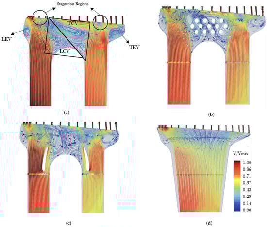 The flow field generated by the FD presence is reported in Figure 5c. Part of the cooling flow is deflected towards the core region, thus reaching the channels’ inlet by circumventing the stagnation areas. Moreover, the core vortices show an almost symmetric structure. The downside of this design is the formation of wakes behind the two profiles, which generates recirculating regions right before the inlets of the cooling channels.