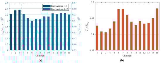 The obtained scenario for the bare anima is reported in Figure 7. The uneven profile of coolant inlet conditions is seemingly correlated with the presence of vortices. Indeed, the 3rd and the 1 channels, located in the proximity of the stagnation areas and relatively far from the vortices, hold the higher coolant flow rates. The third also shows the lowest inlet temperature. The trend of non-homogeneity generally increases from the extremes of the interval 5–10 towards the centre, reaching peaks up to for the mass-flow rate and for the temperature. Likewise, the reduction arises as the flow enters the side branches, from the 3rd to the 1st and from the 13th to the 15th channel. This behaviour is more evident for the temperature distribution, whereas the coolant flow rate coefficients shows a sort of plateau for channels 2–3 and 13–14 and a sudden surge for the edge channels. It can also be inferred that the inlet temperature of the channels at the trailing side are generally higher than the one at the leading side, given the higher flow velocity in the leading than in the trailing duct.