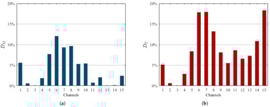 The left-side term in Equation (1) refers to the mass-flow rate distribution coefficient for the ith channel, the one in Equation (2) to the temperature distribution coefficient for the same channel. The reference values and are, respectively, the maximum coolant flow rate and the minimum inlet temperature of the fifteen cooling channels, whereas and are the values relative to the ith channel. As the coolant flow rates of the first three channels and the ones of the remaining thirteen are not comparable, two different reference values are used for the sets 1–3 and 4–15. The distribution coefficients hold positive values, whose magnitude indicates how much a channel is penalized with respect to the optimal conditions (e.g., maximum mass-flow rate/minimum temperature delivered uniformly at each channel).
