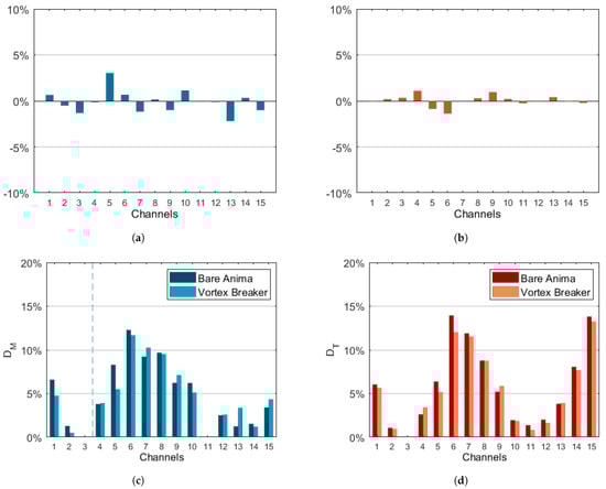 Deviation of coolant inlet conditions of vortex breaker configuration from reference case. (a) Percentual variation of coolant flow rates. (b) Percentual variation of inlet temperatures. (c) Coolant flow rate maldistribution. (d) Inlet temperature maldistribution.