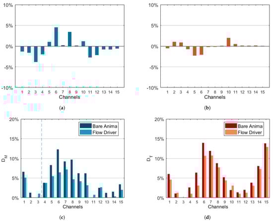 The modifications brought by the flow driver (Figure 9) are more marked than the ones observed with the vortex breaker. The adoption of this design attains beneficial effects on the coolant flow rate of the core channels, leading to an increase up to nearly (Figure 9a). However, the leading side channels 1–4 undergo a corresponding decrease down to . Moreover, despite the lower inlet temperature of channels 5–7 and 13–15, a remarkable surge is observed for the first four and 9–10 channels. Such phenomenon is to be ascribed to the flow being heated up in the recirculating wake behind the airfoils (Figure 9b). The reason for the noticeable rise of the coolant inlet temperature for the first four channels can also be ascribed to the fact that the leading-side aerodynamic element shoves the fluid inside the core, prolonging the flow path that leads to the channels that require the highest flow rate. The resulting profile of the coolant flow rate (Figure 9c) proves for a smoother core region distribution, whilst no major changes arise for the remaining channels. Noticeable modifications appear in the inlet temperature profile (Figure 9d). The distribution in the core channels 5–8 drops around or below and a planer distribution is observed for the trailing branch channels. A detailed study about the impact of the FD stagger angle on the flow recirculation and the cooling channels performance is out of the scope of the present activity and is not currently planned.