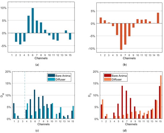 The percentual variations of the coolant inlet conditions with respect to the reference case are reported in Figure 10. The modified design brings some benefits to the core-region channels, which experience an overall rise of the coolant flow rate (channels 5–9, Figure 10a) and a drop of the inlet temperature (channels 5–8) down to nearly (Figure 10b). In particular, channels from 2 to 4 undergo both the reduction of the coolant flow rate and the increase in the inlet temperature, whereas the channels in the trailing branch are only weakly affected. Nevertheless, the diffuser configuration allows for smoothing the coolant inlet conditions, especially in the core region (channels 5–8, Figure 10c,d). Here, the coolant flow rate distribution is stable around and the temperature distribution is well below .
