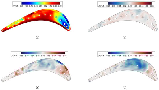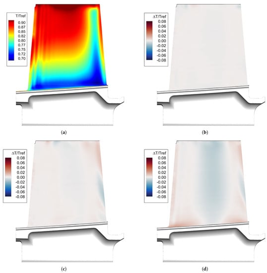 Suction side blade temperature. (a) Temperature profile on BA. (b) Temperature difference with VB. (c) Temperature difference with FD. (d) Temperature difference with DIFF.