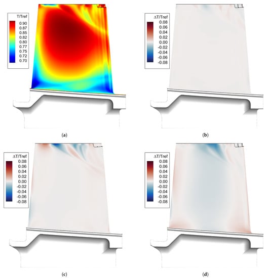 The effect of the internal geometry coolant redistribution over the tip also affects the thermal load over the blade suction side, where the leakage flow tends to move under the pressure gradient. In Figure 16 the difference in temperature on the blade suction side close to the tip region for all the investigated cases with respect to the original configuration is reported.