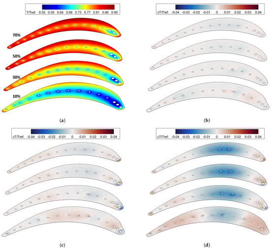 Variation of temperature profile—from bottom to top: 10%, 30%, 50%, and 70% of blade span. (a) Temperature profile on BA. (b) Temperature difference with VB. (c) Temperature difference with FD. (d) Temperature difference with DIFF.