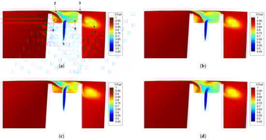 As far as the central region of the squealer is concerned, lower temperatures are found in correspondence of the channels from the fifth the eighth for the FD ( 0.3) and the DIFF ( 0.5) configurations. They both show a higher temperature close to the LE. The cooling of the squealer tip can be ascribed to two different phenomena: coolant recirculation inside of the squealer and radial thermal conduction through the solid. As was shown in Figure 14, the FD (Figure 14c) and DIFF (Figure 14d) configurations highlight a higher penetration of the coolant in correspondence of the fifth channel, which for the FD case allows for hot gas entrainment in the squealer region. This is not in accordance with the lower temperature found in the central region of the tip, suggesting that the reduction of temperature has to be addressed to the heat transfer with the colder solid (Figure 13c). This also explains the higher temperature found in correspondence of the LE channels. This effect is enhanced for the DIFF configuration, which features both an attached coolant in the squealer (Figure 14d) and the lowest solid temperature (Figure 13d).