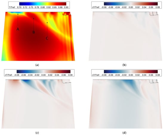 Percentage variations and distributions of both coolant flow rates and inlet temperatures are reported in Figure 8. As it can be observed in Figure 5d, the flow still recirculates in the core, but the large vortex formation taking place in the BA case is no longer present. The flow field outside the core region is virtually unaffected. The percentage variations of the coolant inlet conditions with respect to the reference case are reported in Figure 8a,b.