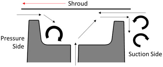 Looking at the bare anima case (Figure 16a), the ejection pattern over the tip can be summarized as follows: attached coolant close to the LE (A), a temperature peak due to tip leakage flow detachment from the suctions side (B), and cold flow transport lapping over the surface close to the trailing edge (C). The driving mechanism for the definition of the temperature field over the suction side at high span is the interaction between the coolant (that travels across the squealer) and the pressure gradient generated by the blade, which force the coolant to be ejected towards the suction side at a certain axial chord. In fact, the flow close to the casing has a tangential velocity defect in the rotor frame, then is forced to move closer to the suction side interacting with the ejected coolant flow. The relative tangential velocity of the coolant and of the suction side flows are opposite in sign, thus generating radial movement of the flow. That leads to the radially downwards streaks visible from roughly 20% of the chord until the TE. The schematic of the mechanism is shown in Figure 17 (see also Kwak et al. [] for various configurations of squealer tip).