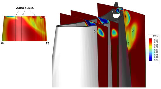 A detailed description of the impact of that mechanism on the development of the TLV is shown in Figure 18, where the effect of hot gas and tip leakage can be shown for the BA case, while moving along the axial chord, the TLV originated by the coolant ejection at the LE shapes up close to the blade LE (D). The interaction between the SS flow and the coolant affects the tip leakage development, preventing the continuous ejection of coolant from the tip and leading to the detachment of the TLV from the blade. Further downstream, the entrained coolant flows out of the tip, generating a twofold structure: the upper one (F) is generated by the freshly ejected coolant, while the lower one can be addressed to the ejection from the central channels of the blade (E).