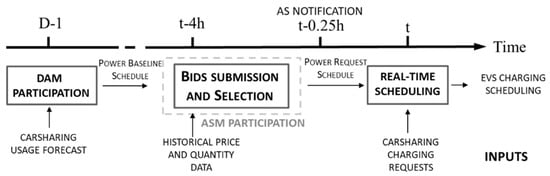 In this scenario, schematically represented in Figure 1, at day D-1, the carsharing operator (operating as an Aggregator) submits requests on the DAM to buy the energy requested the next day (D) to charge the EVs. As a result, a binding day-ahead schedule (hereinafter Power Baseline Schedule) is defined. During the relevant ASM sessions (for instance, according to the scenario in place in Italy, 4 h before the real-time), the Aggregator submits bids for up/downward reserve, which are selected by the Transmission System Operator (TSO) through a pay-as-bid approach and, if accepted, are notified to the Aggregator shortly before the real-time (i.e., 15 min in advance). The combination of DAM and ASM schedules is defined as Power Request Schedule, which represents a commitment toward the market that the Aggregator must respect; otherwise, it is penalized by imbalance fees. In the real-time, EVs are used by carsharing customers. Each user at the end of the rent could connect the car to one of the CSs over the city, or park it in a public spot without a CS. When the EV is plugged into a CS, the CCA optimizes the initial charging time to meet the market commitments, while preserving the final battery’s State of Charge (SoC) according to a deadline defined by the carsharing operator.