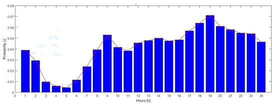 The usage of each EV in the carsharing fleet is simulated considering the stochastic model described in Section 3. The statistical parameters adopted are based on the real data of carsharing usage in Milan collected during the weekdays of 2018, shown in Figure 2 and Table 1. EVs involved in the fleet are assumed to having , and respectively equal to 7 kW, 40 kWh and 0.2 kWh/km [25]. These hypotheses are coherent with the scenario under analysis: a carsharing fleet composed, for technical and economic reasons, by low-cost EVs having similar characteristics.