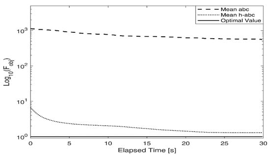 In the ABC, the three phases are iteratively repeated until a maximum number of iterations (); then, the solution with the lowest value of the objective function is selected as the optimal one. In h-ABC, a more advanced stopping criterion is introduced in addition to the one just described: after a fixed number of iterations (), the objective function trend is analyzed. If the populations do not improve their objective function for a given number of iterations (empirically set to 5 in the numerical analyses that follow), the iterative process stops, avoiding the unnecessary computation of cycles not improving the solutions.