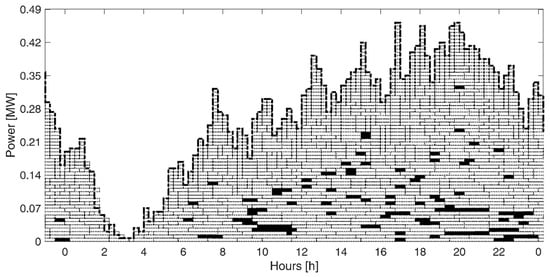 In the DAM, the Aggregator purchases the Power Baseline Schedule, which defines for every hour of the day D the amount of power that should be absorbed to charge the EVs’ fleet. An accurate forecast of energy requirements for the next day is essential since a mismatch between the power actually absorbed in real-time and the scheduled one implies an economic penalty (i.e., imbalance fee). The development of forecasting algorithms is out of the scope of this work; thus, a simplistic approach is adopted to estimate future power withdrawals from the grid, based on the persistence model [24]. In the session of the DAM on the day D-1, the Power Baseline Schedule is forecasted, assuming as a reference the profile of charging requests registered on the previous day (D-2). In particular, the Power Baseline Schedule () is defined, assuming all the charging requests at day D-2 are satisfied as soon as the EVs were connected to the CS:
