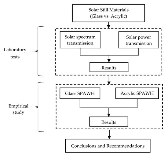 The thermal performance of glazing and water production from atmospheric air were investigated based on two phases, as shown in Figure 2. The first phase is a laboratory test of glass and acrylic properties in terms of solar spectrum transmission and solar power transmission. The second phase covered an experimental study to examine water production and systems efficiency of glass and acrylic glazing systems.