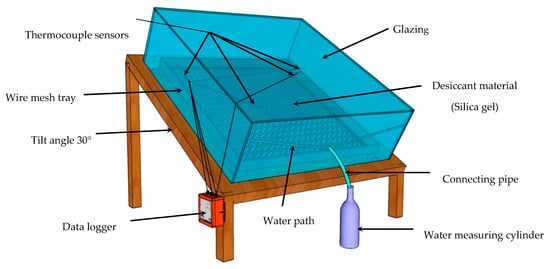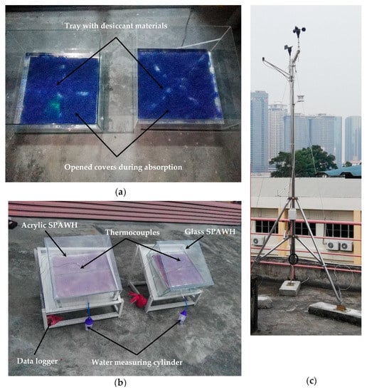 In this experimental study, the solar-powered atmospheric water harvesting systems (SPAWH) were designed, manufactured and used, as shown in Figure 5. The first SPAWH is fabricated by assembling a clear Perspex acrylic box (60 cm (L) × 60 cm (W) × 30 cm (H)). The upper cover is adjusted to be removable for the processes of sorption and desorption.