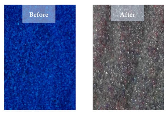 For collecting condensed water, a pipe was connected to the system. During the regeneration process, a transparent 3 mm acrylic, which acts as a condenser, is used for glazing. The desiccant material (silica gel) was held by a wire mesh sized 3 mm × 3 mm, screwed to the L shape frame (Figure 6). A measuring cylinder with a reading of 5 mL is used to measure the quantity of water generated. Figure 7 displays the desiccant material before and after the absorption process in the SPAWH. Table 3 provides more details about SPAWH main parts.
