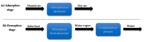 - Desorption and condensation process on the next day. The desiccant is isolated from the ambient air and the solar heat is applied to desorb the water vapor, which is finally condensed and collected.