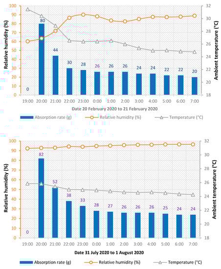 Both SPAWH systems (glass and acrylic) covers were opened during nighttime to measure the adsorption rate of the desiccant materials. The adsorption rate was manually recorded for 12 h from 7:00 p.m. to 7:00 a.m. with half-hour intervals. Generally, both systems’ adsorption rate was similar, as the same weight of desiccant materials was placed in each system (2000 g of silica gel). Figure 9 shows the adsorption rate alongside relative humidity and ambient air temperature. At the initial stage, maximum adsorption rate was recorded at 0.080 kg/h and 0.082 kg/h followed by 0.044 kg/h and 0.052 kg/h on 21 February 2020 and 31 July 2020, respectively.