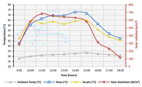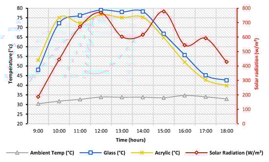 - The power transmission in glass samples (3 mm–8 mm) is reduced from 82–70%, while, for acrylic samples, the percentage was maintained for all samples with different thicknesses and achieved 91%. These findings showed that the SPAWHg desiccant materials maintained higher temperatures along with the daytime with less heat loss, hence, increased system efficiency.
