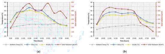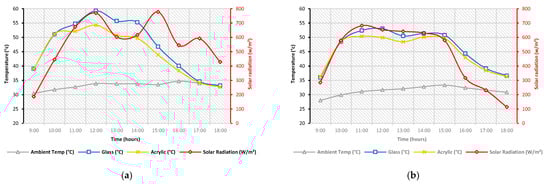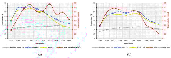 Figure 10 and Figure 11 show the variation in desiccant temperature and solar radiation with time in both SPAWH (glass and acrylic). In SPAWHg, the maximum desiccant temperature reached 79 °C and 73 °C, whereas for SPAWHa reached 77 °C and 65 °C on 21 February 2020 and 1 August 2020, respectively. Generally, the desiccant temperature in SPAWHg was higher than SPAWHa during the daytime.