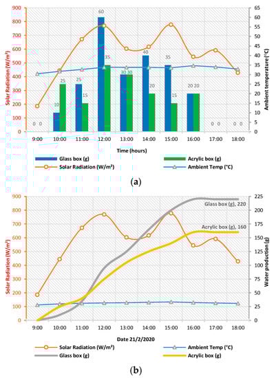 Variation of water production by glass and acrylic glazing systems on 21 February 2020: (a) hourly water produced and (b) accumulated water produced.