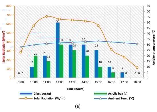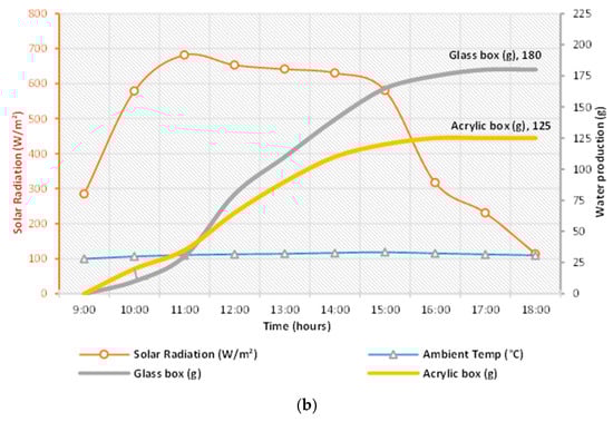 The water production and system efficiency in SPAWHg were higher than SPAWHa. As shown in Figure 15 and Figure 16, water production from SPAWHg was 220 and 180 g/day, whereas for SPAWHa, it was 160 and 125 g/day on 21 February 2020 and 1 August 2020, respectively. Although acrylic allowed more solar energy transmission into the SPAWH, the thermal conductivity of the glass is higher, which led to rising the net heat of SPAWHg. In addition, the characteristics of glass reduce heat loss from SPAWHg into the surroundings, which leads to an increase in the temperature inside SPAWHg and generates more water. The rate of energy entry and temperature of the condenser has an effect on desorption kinetics as well [51]. Both factors are no longer constant if solar energy is used. As a result of the overall heat increment, the overall performance of SPAWH improved when the design of the adsorption-desorption system was efficient.