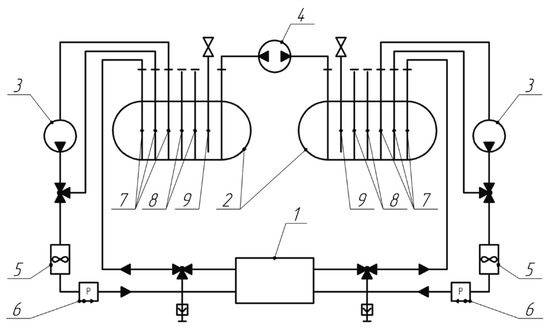 Hydrodynamic scheme of the stand: 1—flow battery stack; 2—tanks with electrolyte; 3—main electrolyte pumps; 4—balancing pump; 5—electrolyte flow sensors; 6—pressure sensors; 7—outlet pipes R-32; 8—branch pipes with an outlet in the form of a fitting; 9—branch pipes KD-10 with pressure relief valves.