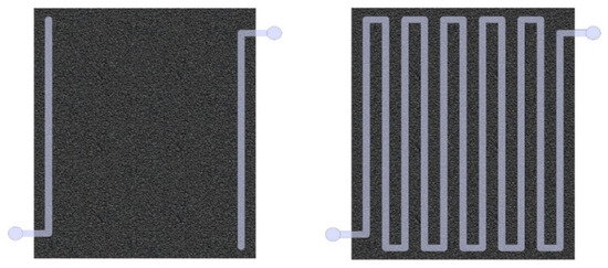 Mathematical modeling of hydrodynamics was carried out in the COMSOL Multiphysics. The purpose of this model is to compare 2 different flow cell designs [1]. Figure 3 shows models of half cells that simulate fluid flows through the channel. The size of the calculation area was 150 × 120 mm, the depth of the channels varies from 0.5 to 1.5 mm, the width of the channels varies from 3 to 8 mm, and the number of channels varies from 3 to 19. The material of the plate is graphite with a resistivity of 8 μΩ·m. The size of the porous carbon material in the case of a design with a serpentine channel is 150 × 120 × 1 mm, and the porosity is 92%. The most optimal design, i.e., Design 2, was then compared with Design 1.