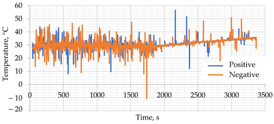 Figure 5 shows the temperature curves. The temperature for the positive electrolyte rises faster than for the negative ones. This trend is observed for all modes. As is known, in addition to the release of heat due to electrical resistance in these batteries, there is an electrolyte crossover [8,10]. Due to the fact that V2+ and V3+ have a smaller diameter than the VO2+ and VO2+ ions, the flow of ions from the tank with a negative electrolyte to the tank with a positive electrolyte is stronger than in the opposite direction. This, most likely, causes additional overheating of the positive electrolyte. The difference in temperature between the positive and negative electrolytes ranges from 7 to 11%.