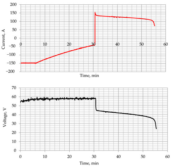 As can be seen from Figure 6, at a discharge voltage of 33–34 V on the stack and a current of 100 A, an inflection begins, which indicates the end of the discharge. Thus, the spread between the charge and discharge voltage is 24–25 V, which is 43% of the charge voltage. Such a voltage spread requires special designs of inverters.
