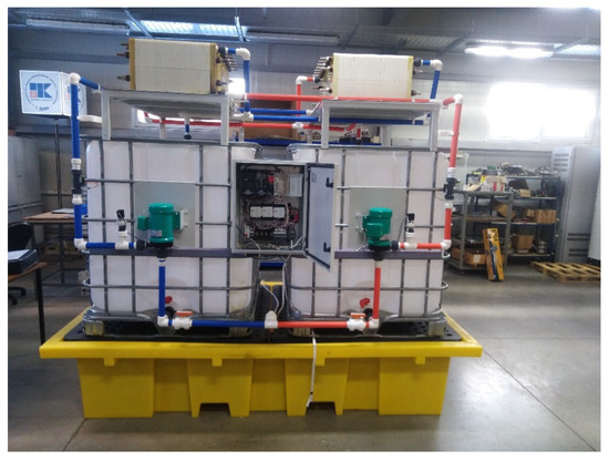 A laboratory stand was developed and manufactured for testing the VRFB. The hydrodynamic scheme of the VRFB consists of two tanks with positive and negative electrolytes, with separate pumps creating electrolyte flows (Figure 2).